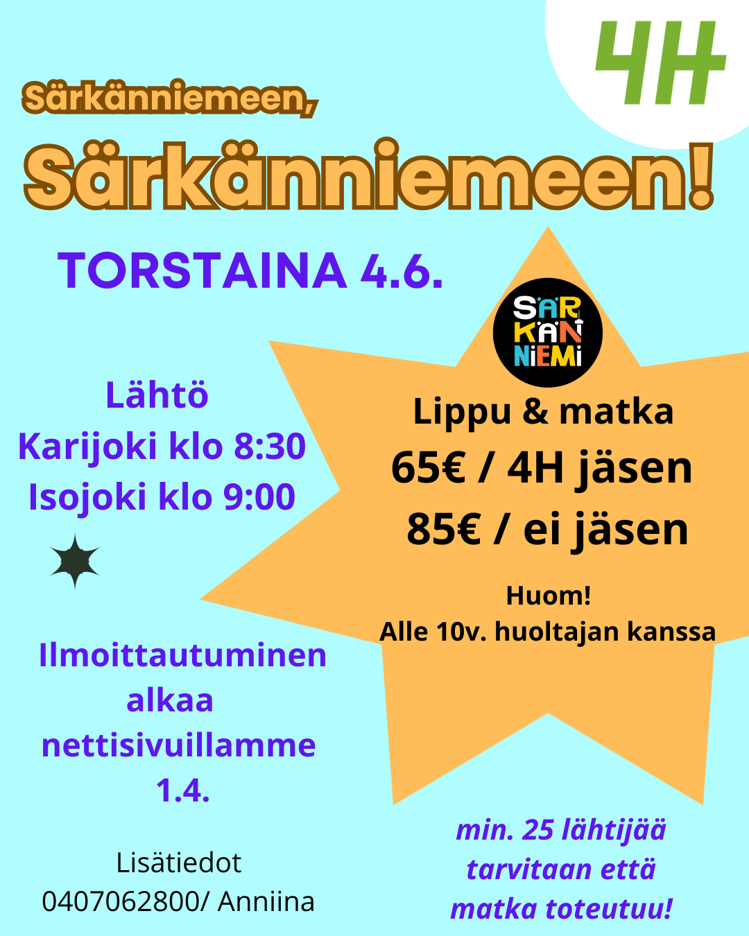 Huvipuistossa kuljetaan yksin tai yhdessä kaverin kanssa. Alle 10v. huoltajan (yli15v) kanssa. Matkalle mukaan mahtuu 52 lähtijää ja matka toteutuu kun ilmoittautuneita on min. 25hlö.